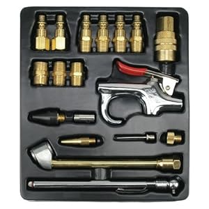 Ampro's 18pc Air Tool Accessory Kit includes the most popular to enhance the performance of pneumatic tools. The kit includes the following: 2pc 1/4" NPT Brass Female Nipples, 4pc 1/4" NPT Brass Male Nipples, 1pc 1/4" NPT Brass Female Coupler, 1pc Male Hose Connector, 2pc Female Hose Connectors, 1pc Tapered Rubber Blower Tip, 1pc Safety Nozzle, 1pc Brass Taper Chuck, 1pc Inflation Needle, 1pc Brass Chuck Adapter, 1pc Air Blow Gun, 1pc 1/4" Female NPT Dual Head Tire Chuck, and 1pc Tire Gauge.
